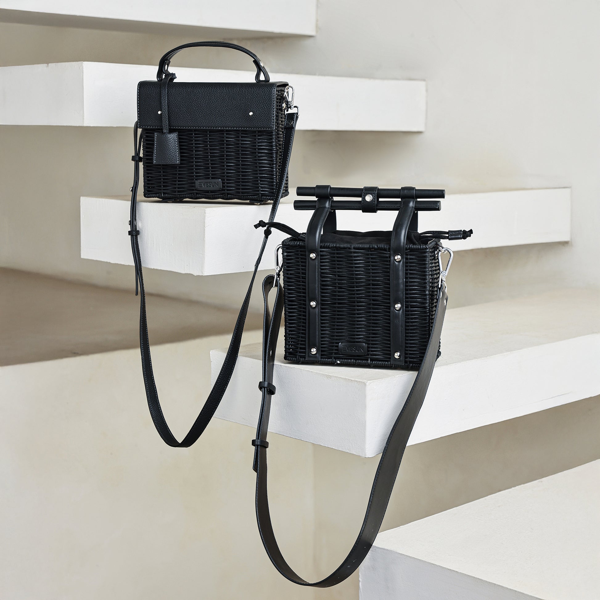 Black Cane Top Handle Bag – Structured Wicker Crossbody Handbag