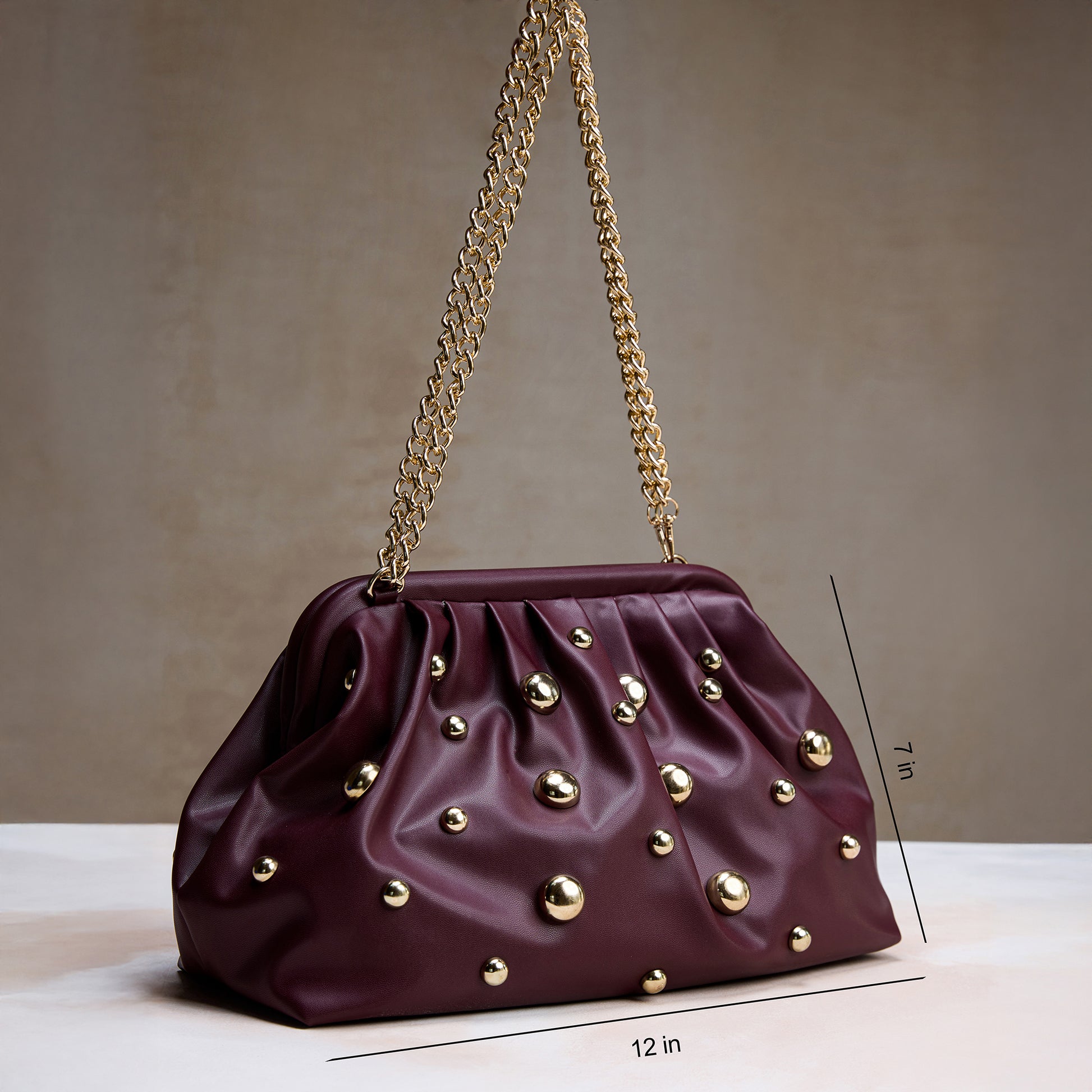 The Burgundy Studded Clutch with Dettachable Shoulder chain is crafted in a luxe maroon finish with sculpted draping and statement gold studs. This designer evening handbag is lightweight and can be used as a clutch or as a shoulder bag. It comes with a dettachable gold chain strap. It instantly elevates formal look, party dresses and festive outfits and designed for women who love to own statement pieces.