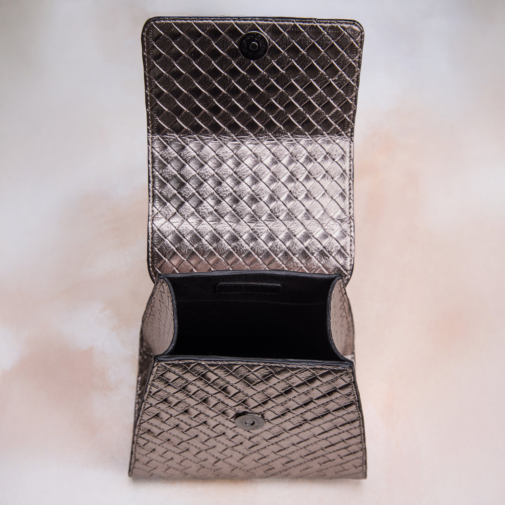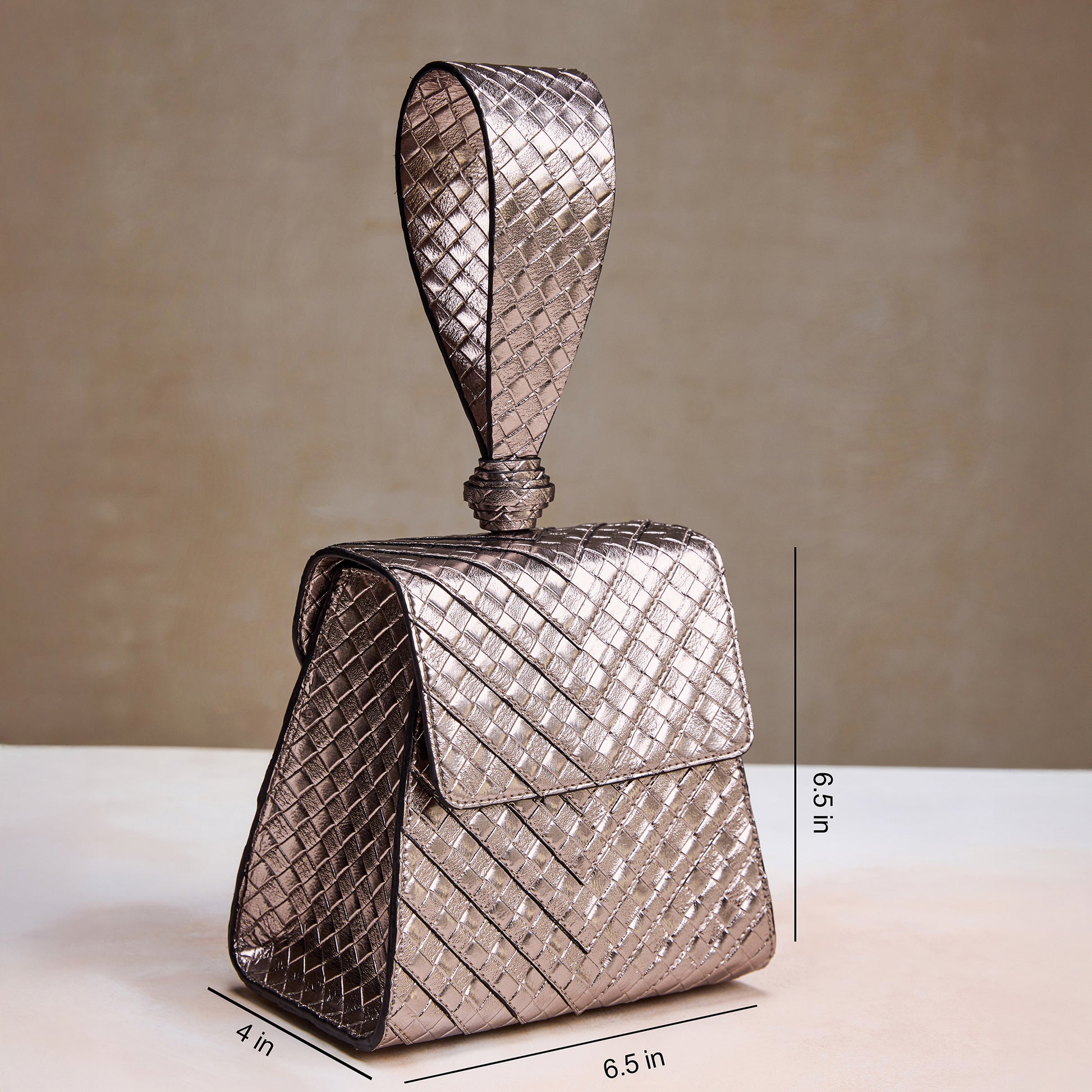 The Gunmetal Wristlet is a structured metallic evening bag designed for women who love bold, elevated accessories. Crafted in a luxe woven-texture finish with a sculpted wrist strap, this statement clutch instantly upgrades sarees, cocktail dresses, festive co-ords, and wedding guest looks.
