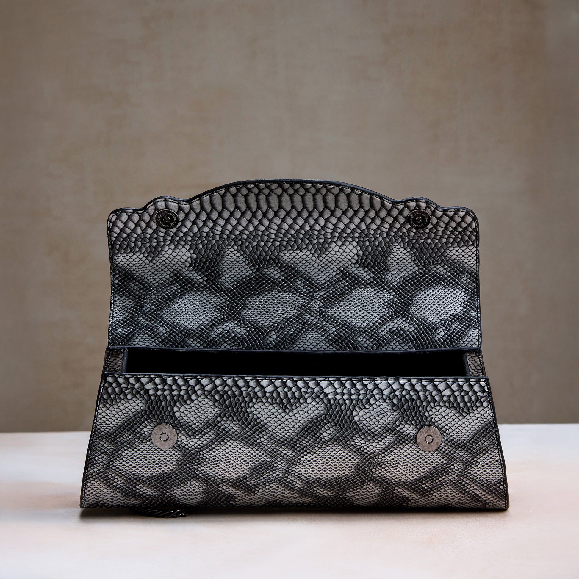 The Silver Snake Print Clutch is a metallic evening handbag designed for brunch to party and formal events. It can be carried as a clutch or with a long chain handle. Featuring a luxe python-inspired texture, sculpted flap design, and detachable chain strap, it blends edgy sophistication with timeless elegance.